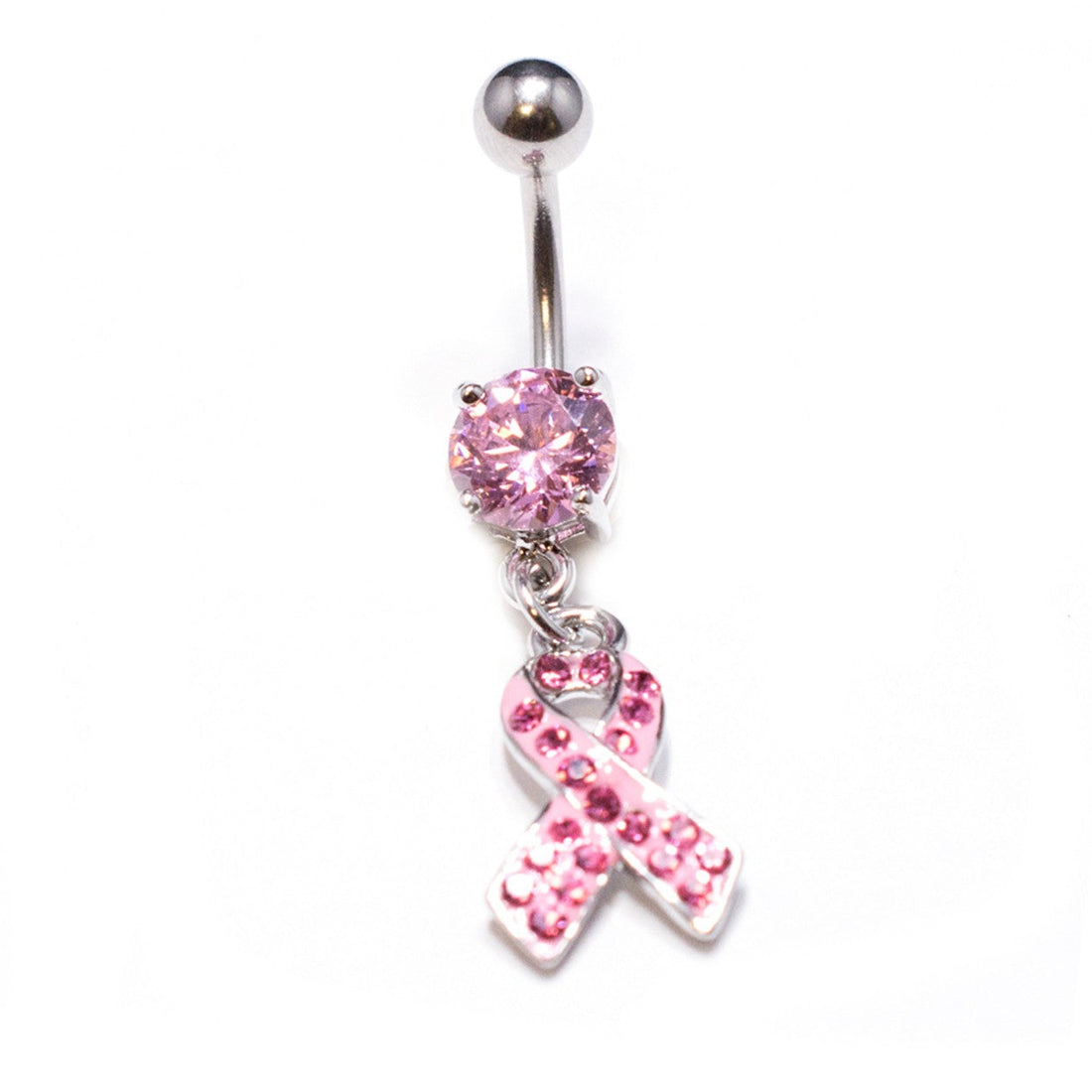 316L Surgical steel belly ring with pink jewelled cancer-support ribbon design. Externally Threaded. 14 Gauge...