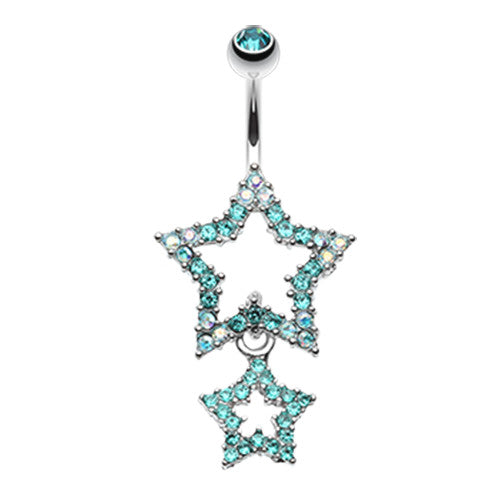 316L Surgical steel belly ring with 2 jewelled dangly stars. Externally Threaded. 14 Gauge X...
