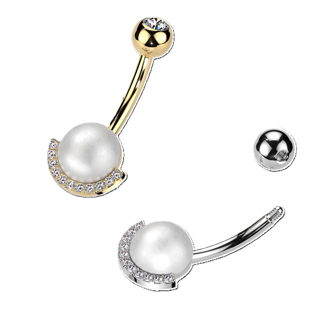 316L Surgical steel belly ring with beautiful with faux pearl and cubic zirconia around the...