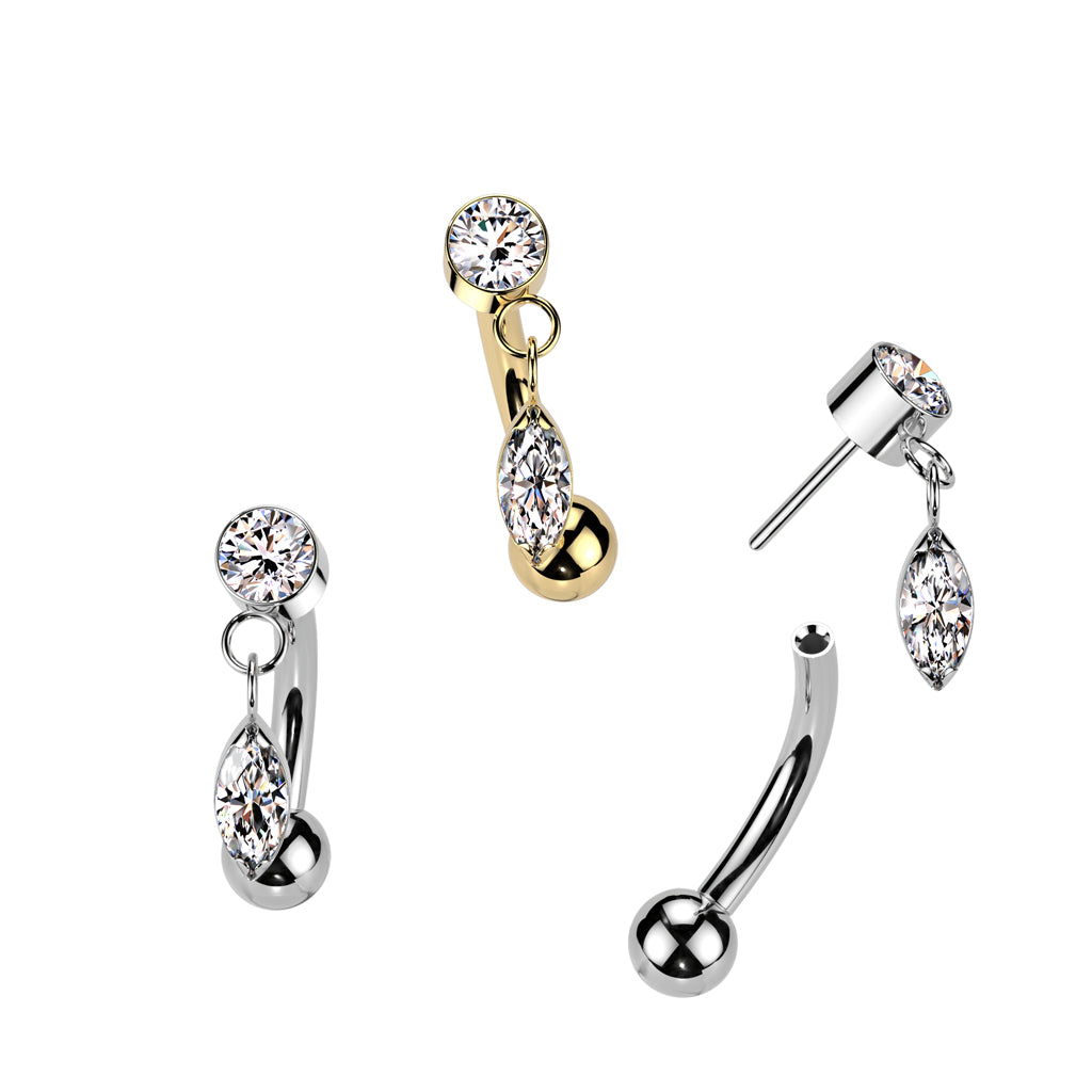 Implant grade titanium curved barbell with threadless top gem and dangly marquise cubic zirconia gem. ...