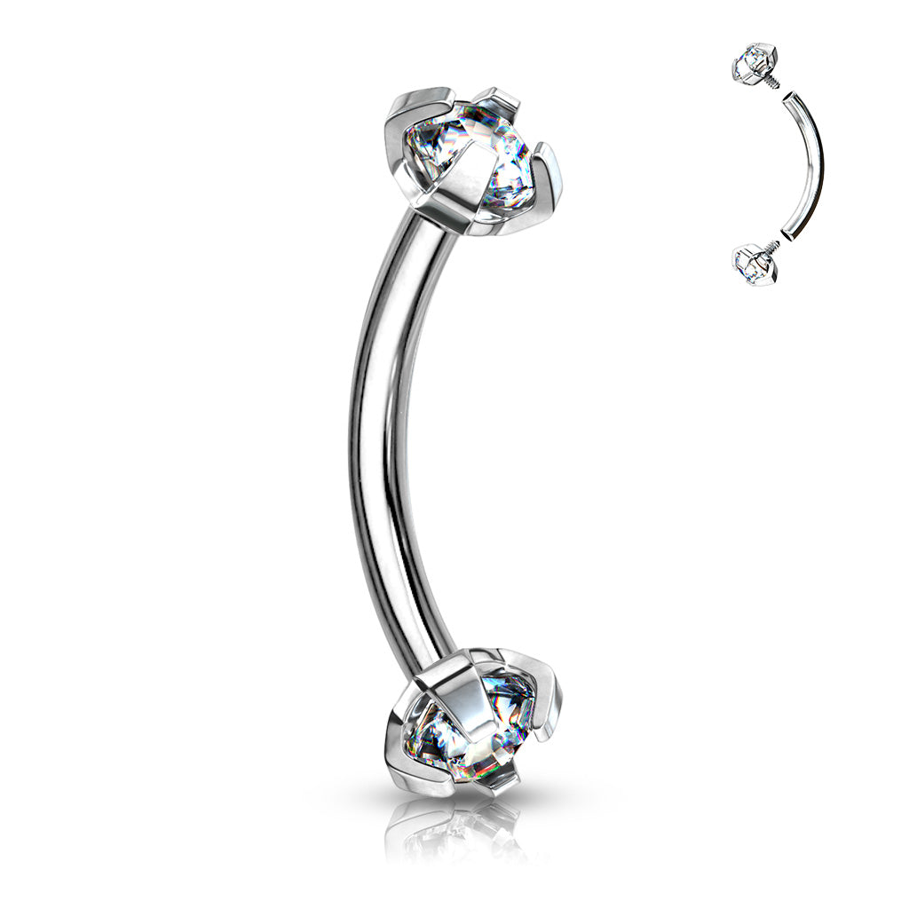 316L Surgical steel curved barbell with internally threaded prong-set gems. Internally Threaded. 16 Gauge X 8mm...
