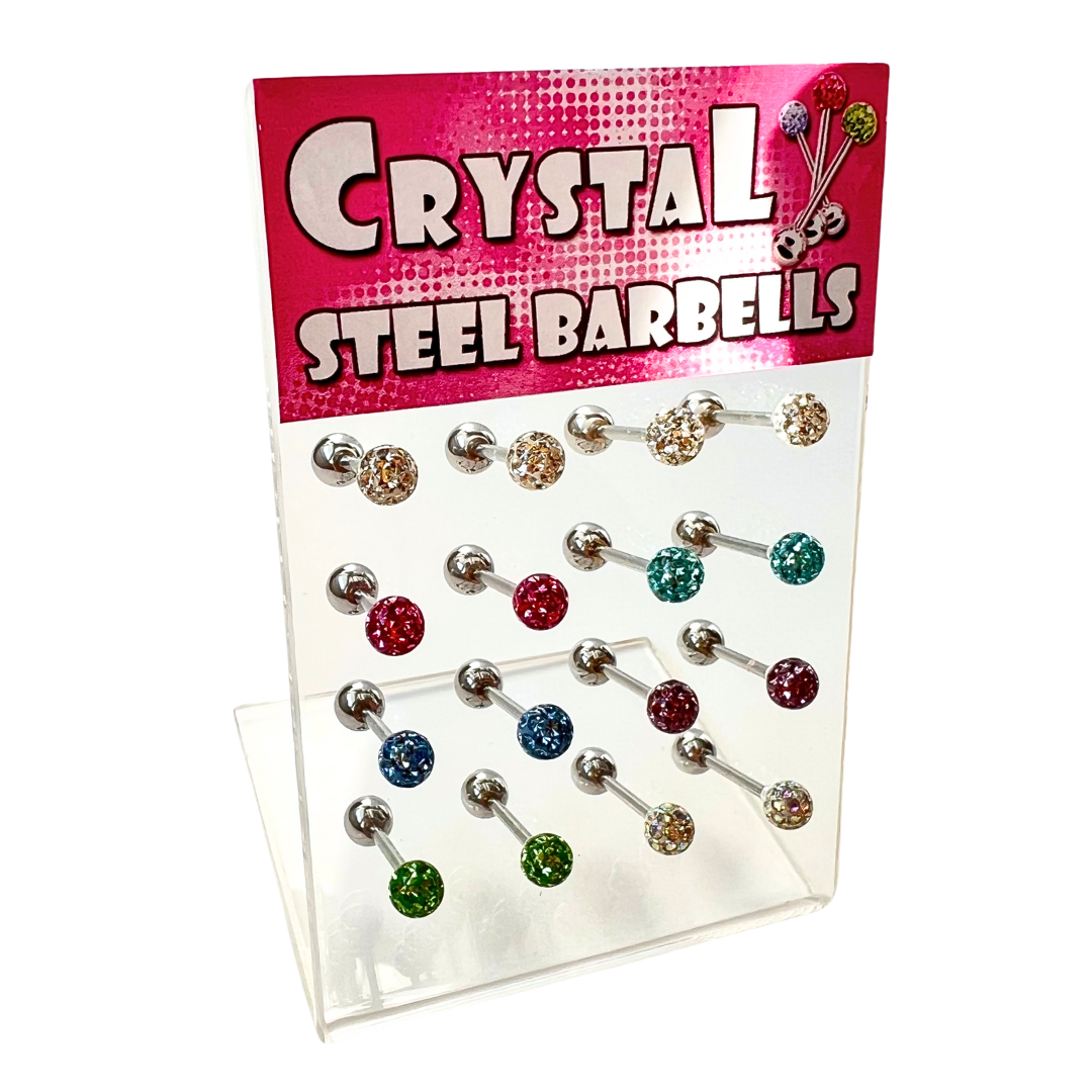 Display stand with 16 pieces of tiffany tongue barbells. 14 gauge X 16mm Externally Threaded. Sold...