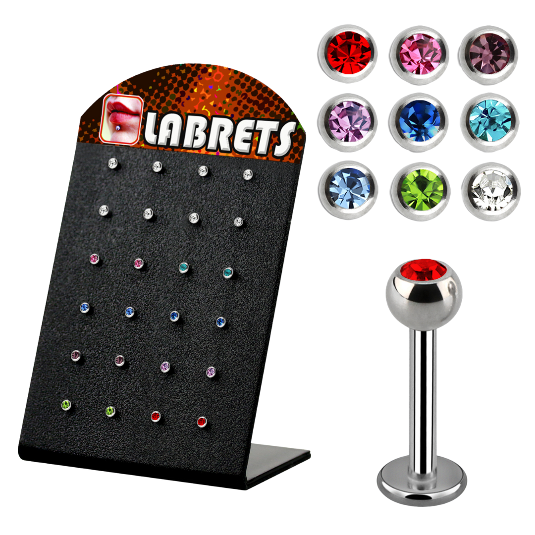 Display stand with 24 assorted length labrets with press-set gem balls. 316L Surgical steel labrets...