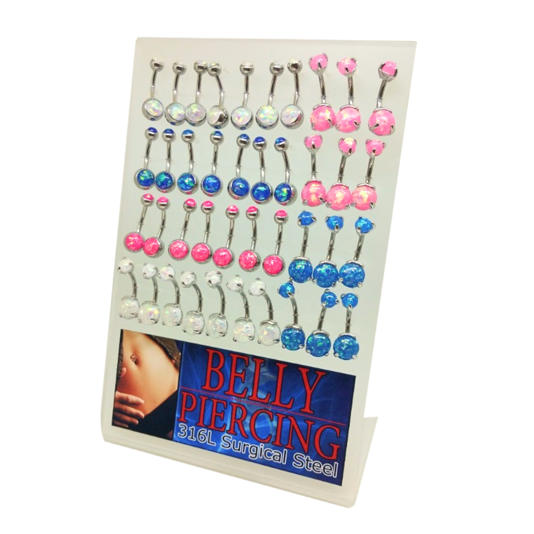 Display stand of 40 pieces of glitter opal belly rings. 14 gauge X 11mm Externally Threaded....