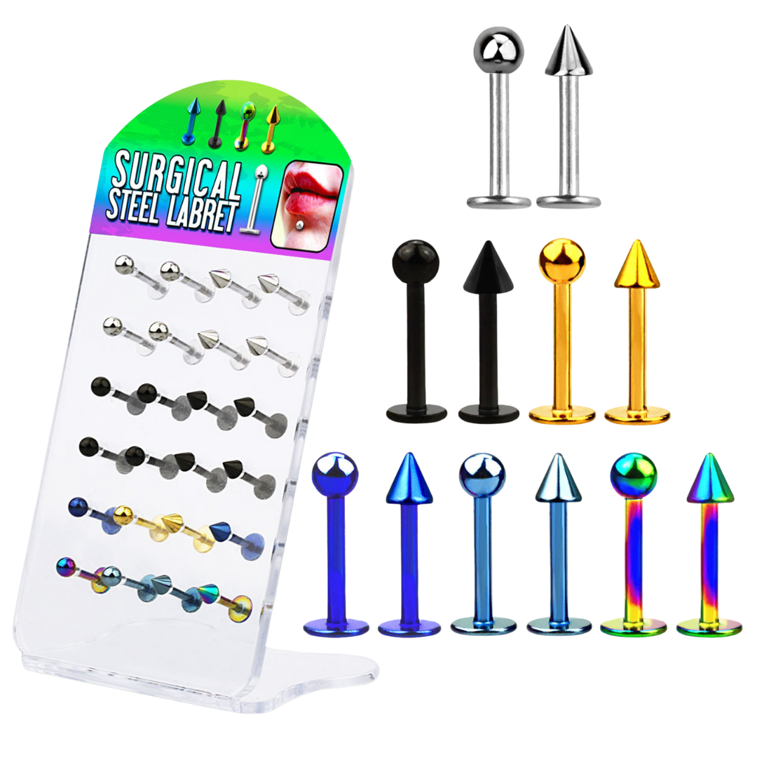 Display Of 24 Steel and Anodized Labrets