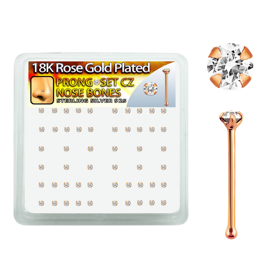 18 karat rose gold plated sterling silver nose studs with 1.5mm clear prong-set gem. Available...