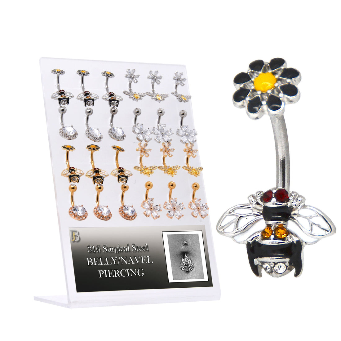 Display stand of 24 pieces of fancy belly rings with bees and flowers. Externally Threaded. 14 gauge...