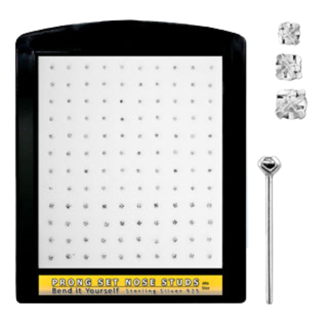 Sterling silver nose studs on a display stand of 120 pieces. Available in nose bones,...