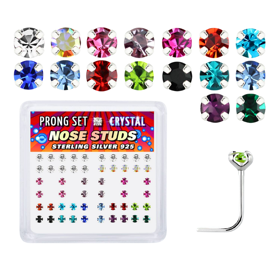 Sterling silver nose bones with prong-set gems in box of 20 pieces. 22 Gauge X 6mm...