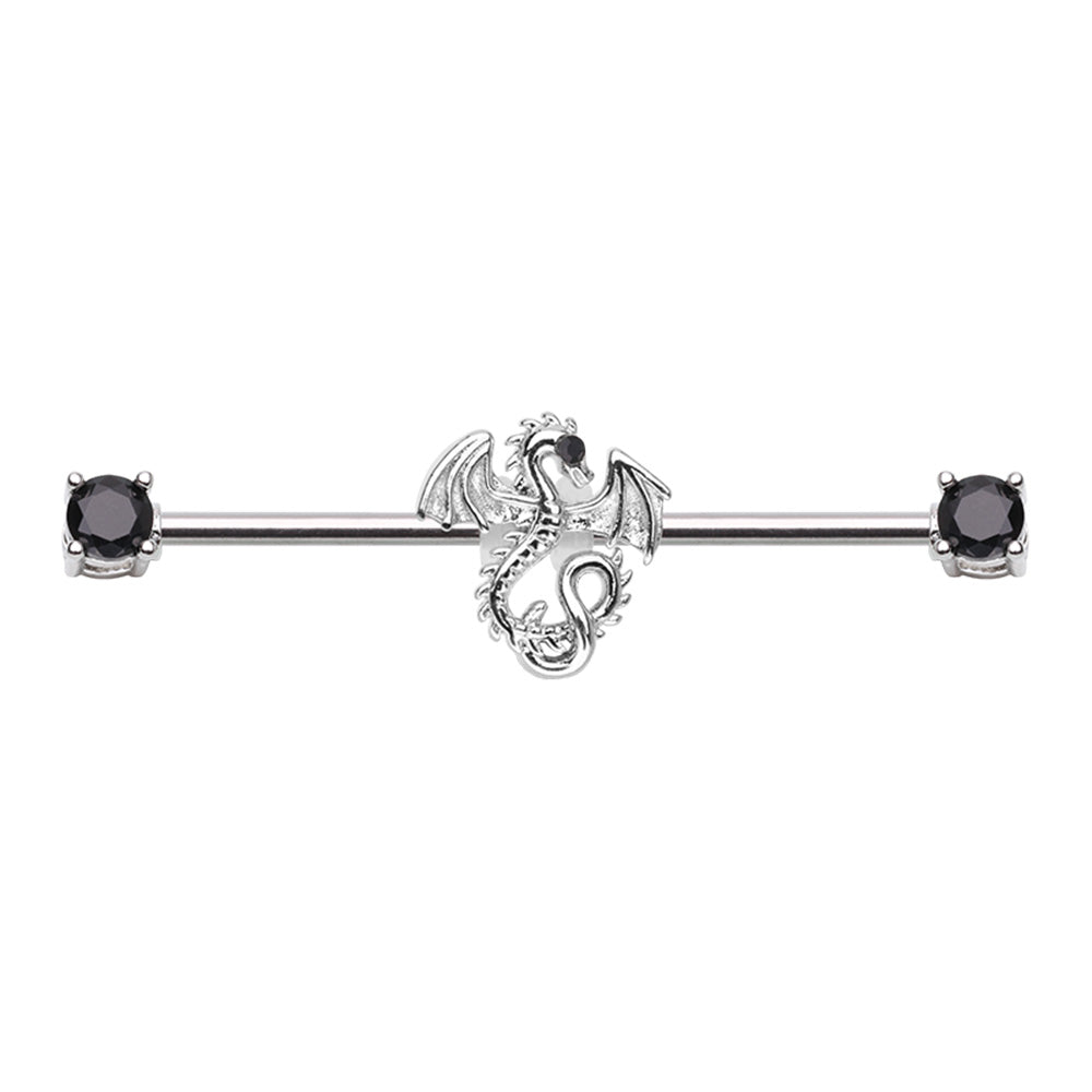 316L Surgical steel industrial with black prong-set gems on the ends, and a fierce dragon...