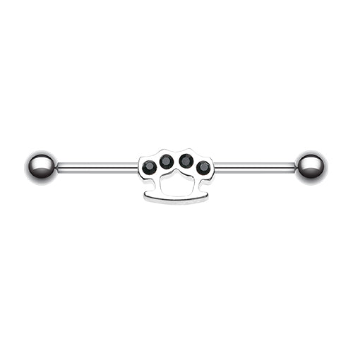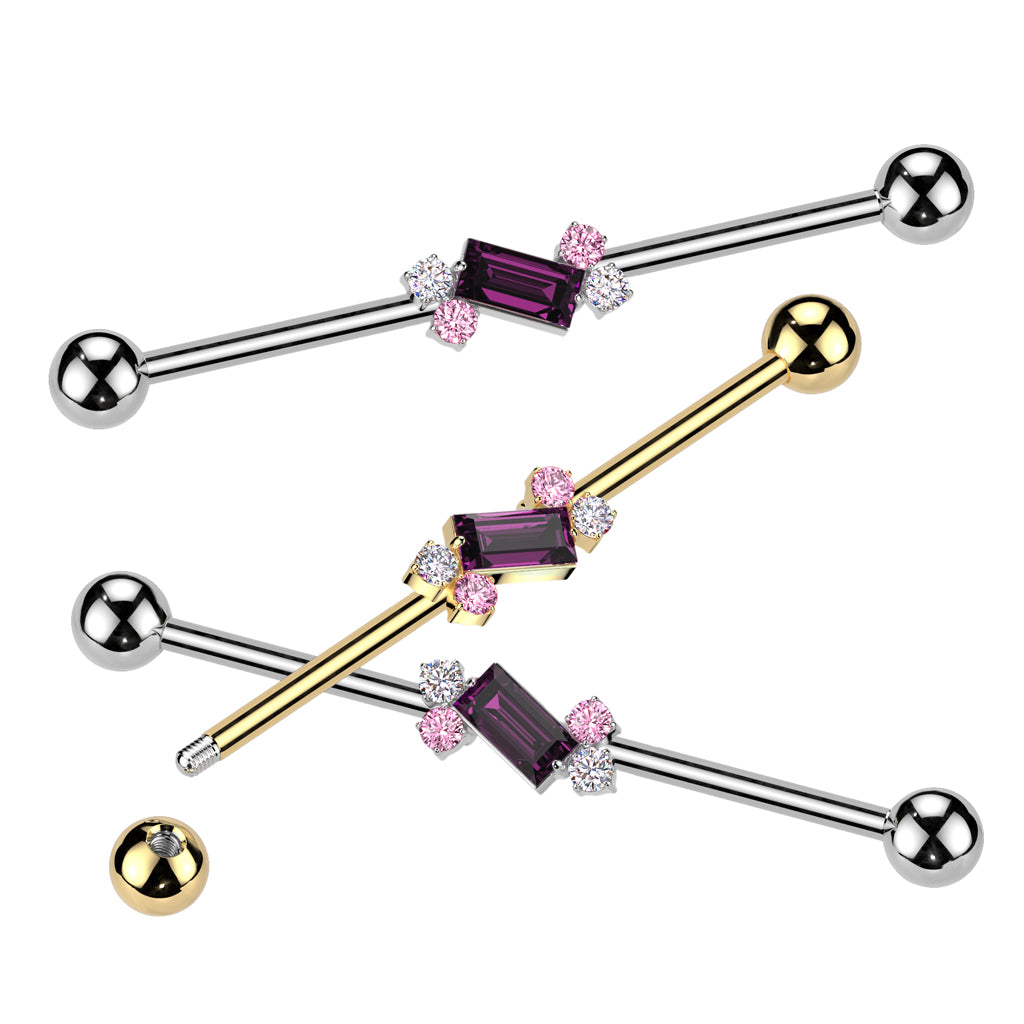 Industrial barbell with beautiful cubic zirconia gems, in a geometric pattern. Externally Threaded. 14 Gauge...