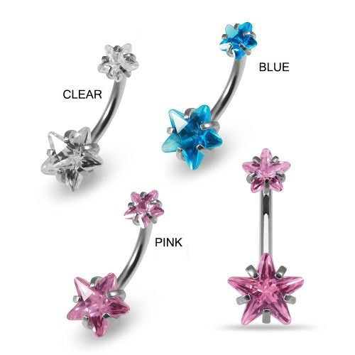 316L Surgical steel belly ring with internally threaded star-shaped cubic zirconias. Internally Threaded. 14 Gauge...