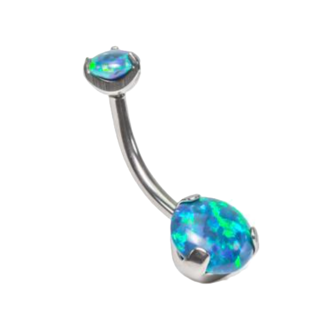 Implant grade titanium curved barbell with internally threaded prong-set glitter opal on each end. These curved barbells...