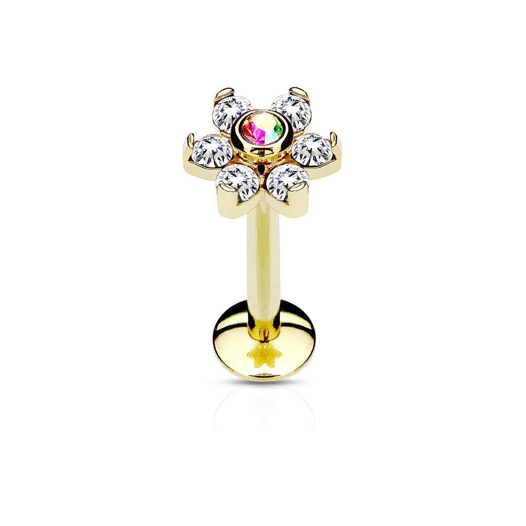 Gold titanium plated over 316L Surgical steel labret with internally threaded 6 gem flower. Flower...