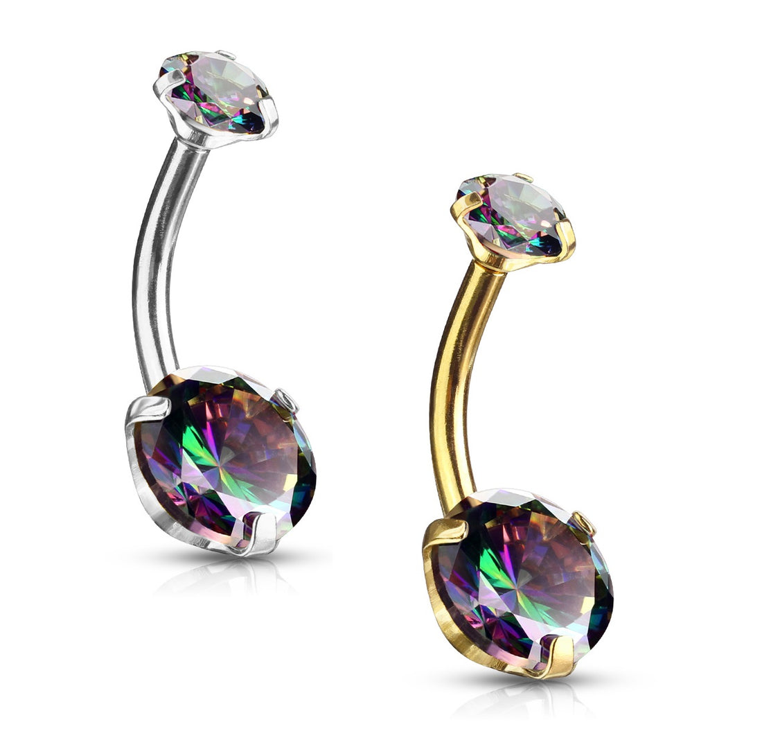 316L Surgical steel belly banana with beautiful multi-coloured faceted prong-set vitrail gems. Internally threaded top...