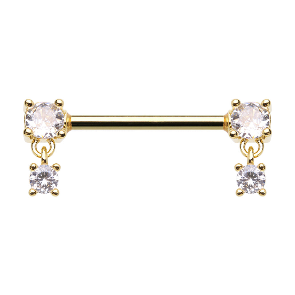 Gold titanium PVD coated 316L surgical steel nipple barbell with dangly cubic zirconia on each...