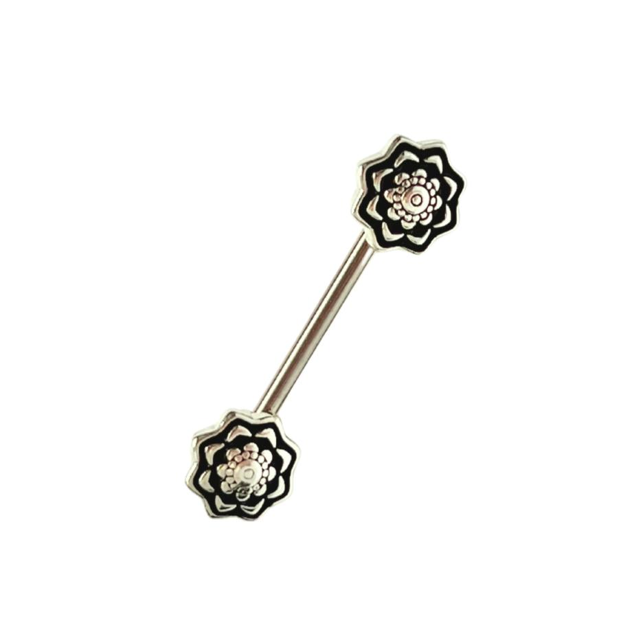 Surgical steel nipple barbell with black accented roses on each end. Barbell is 316L surgical...