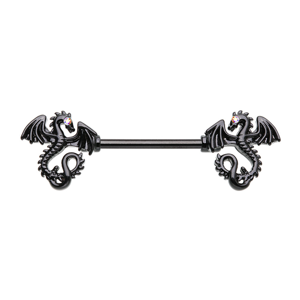 Black titanium PVD over 316L surgical steel barbell with intricate dragon design. Externally Threaded. 14...