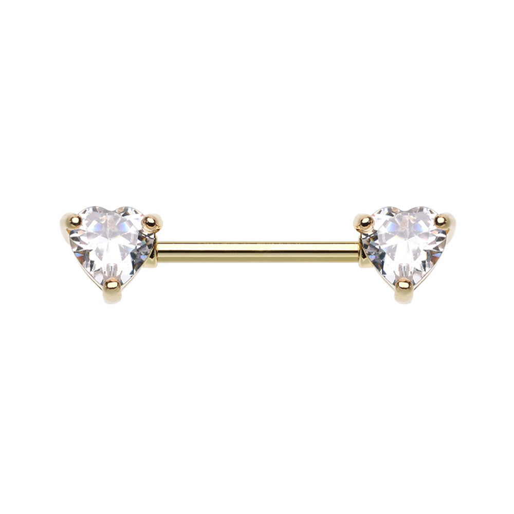 Gold tianium PVD plated 316L surgical steel nipple barbell with prong-set heart shaped cubic zirconia. ...