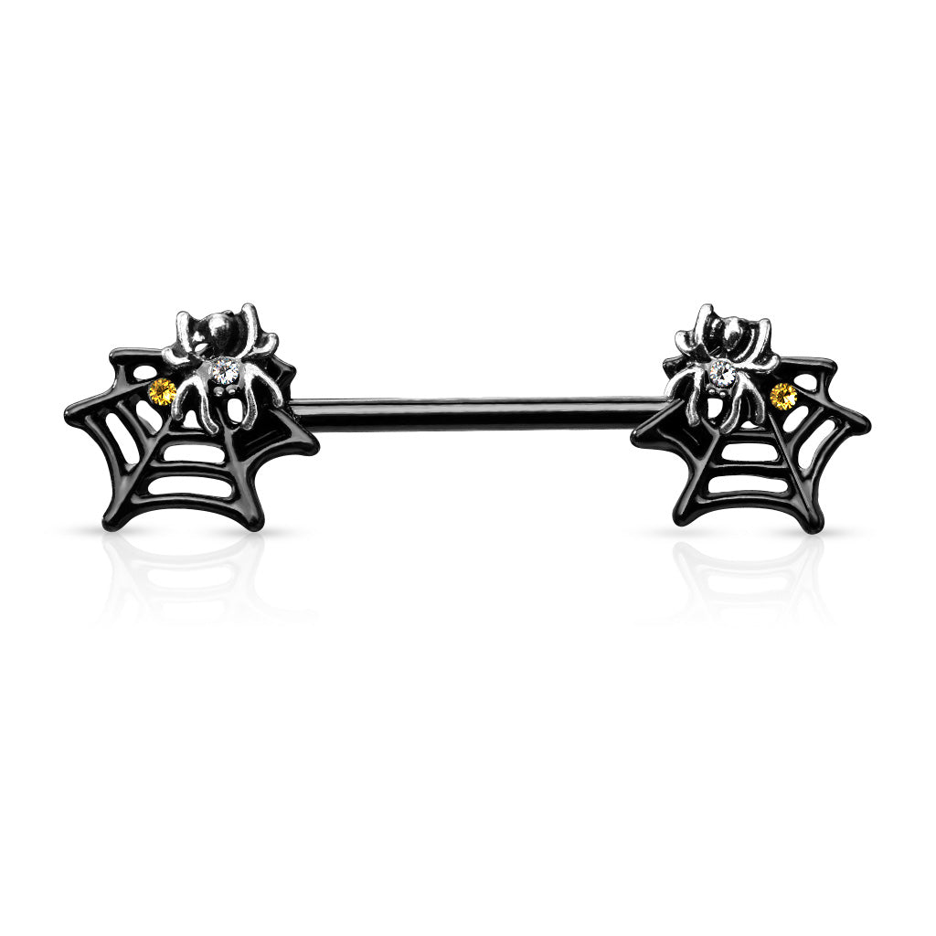 Black titanium coated 316L surgical steel nipple barbell with spiderweb ends. Externally threaded. 14 Gauge X...