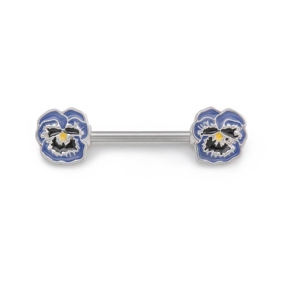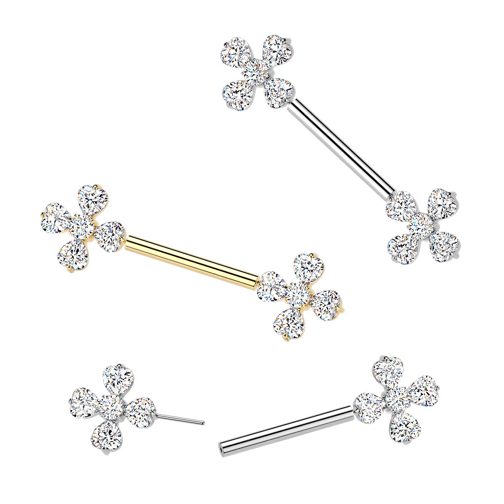 316L Surgical steel nipple barbell with a single cubic zirconia in a flower design on...