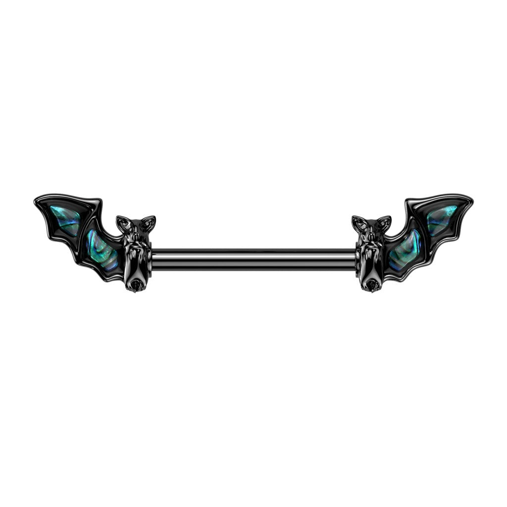 316L surgical steel nipple barbell with black titanium PVD coating, and an abalone shell bat design. ...