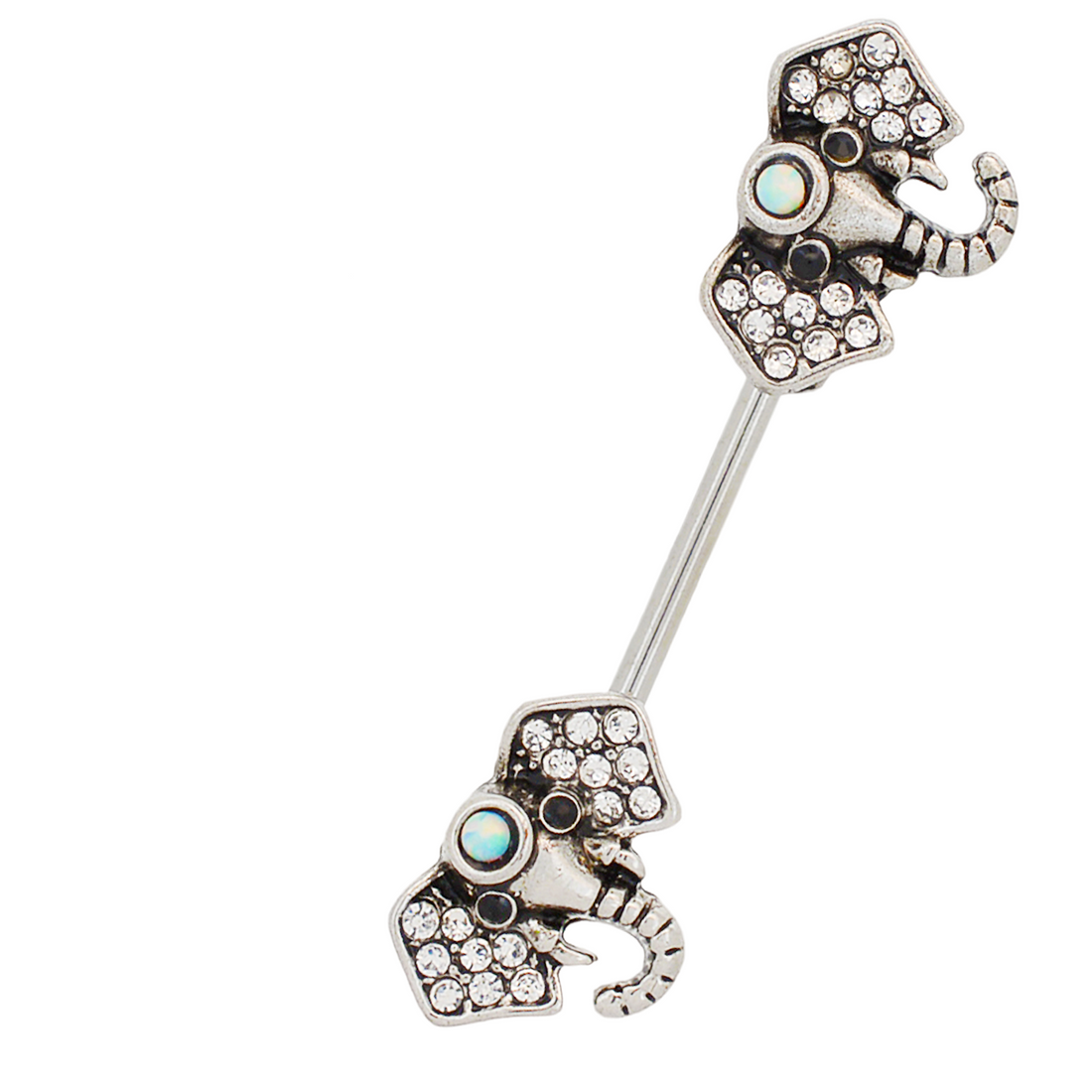 316L surgical steel barbell with cubic zirconia and glitter opal encrusted elephant head. Externally threaded 14 Gauge x...