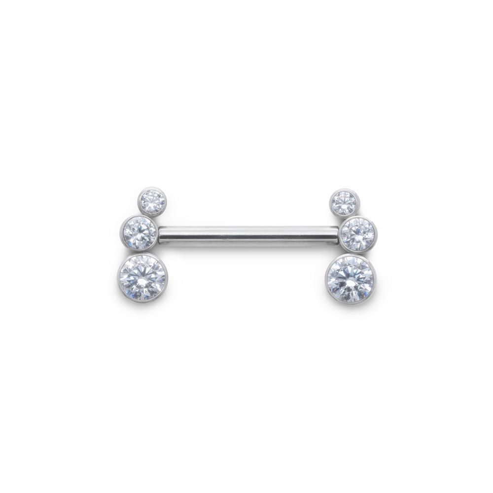 316L Surgical steel nipple barbell with 5 clear cubic zirconia on each end. Both ends...