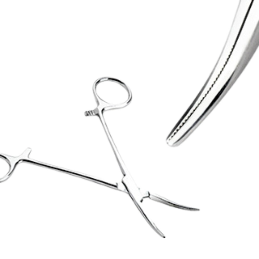 Stainless steel curved kelly hemostat with micro-thin (0.5mm) tip with 2mm hole for holding dermal...