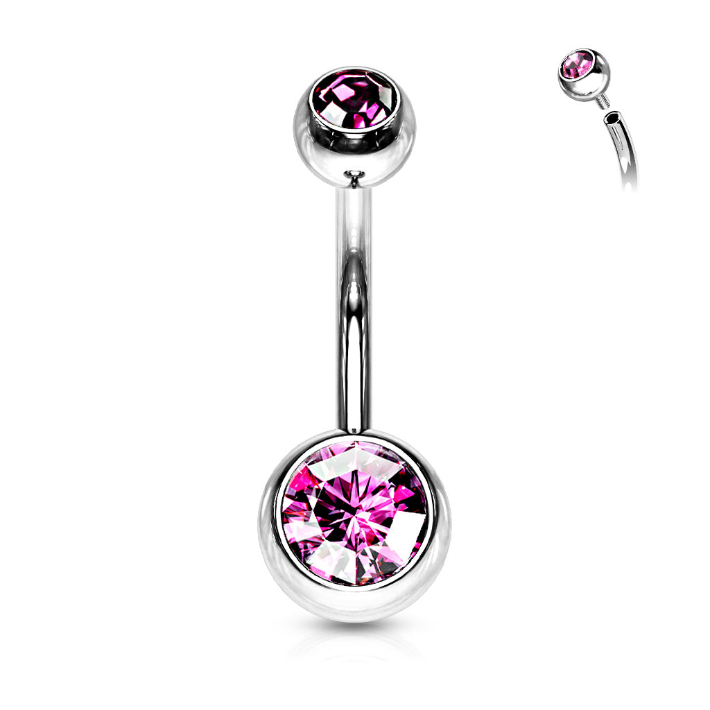 316L surgical steel double jewel belly ring with internally threaded top ball and press-set gems.