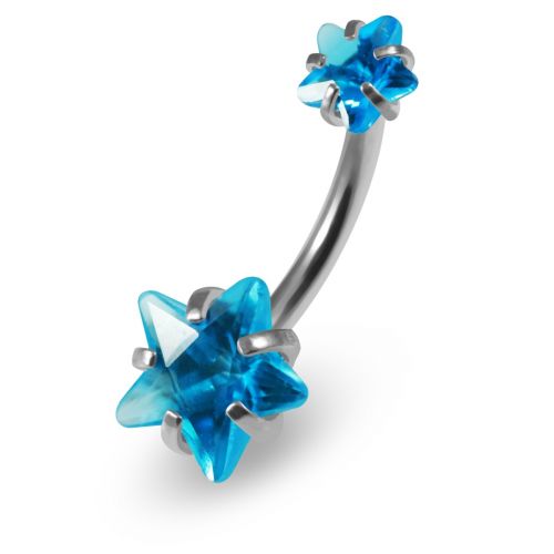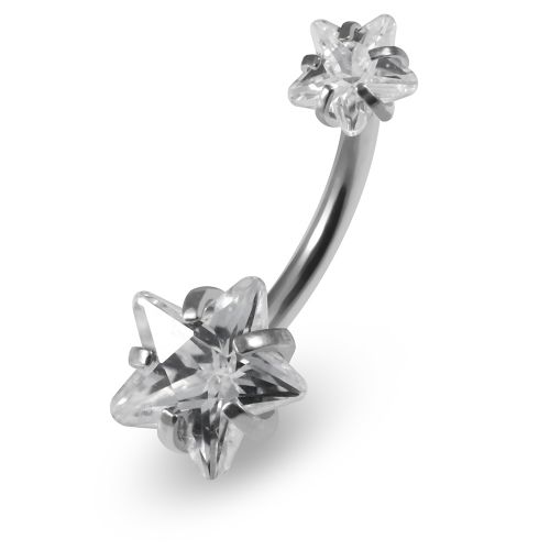 316L Surgical steel belly ring with internally threaded star-shaped cubic zirconias.