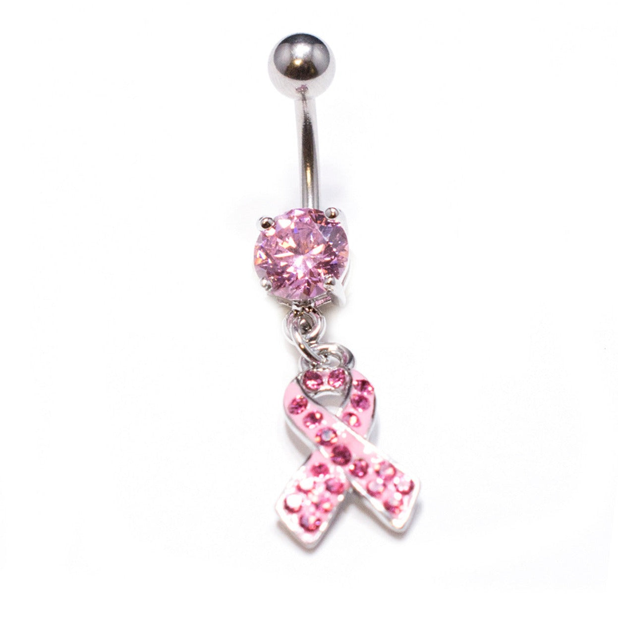 316L Surgical steel belly ring with pink jewelled cancer-support ribbon design.  Externally Threaded.