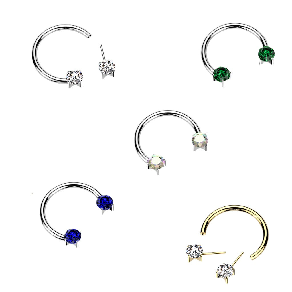 Titanium horseshoe with threadless prong-set cubic zirconia.  These beautiful jewelled horseshoes are perfect for septum, lip, or cartilage piercings.