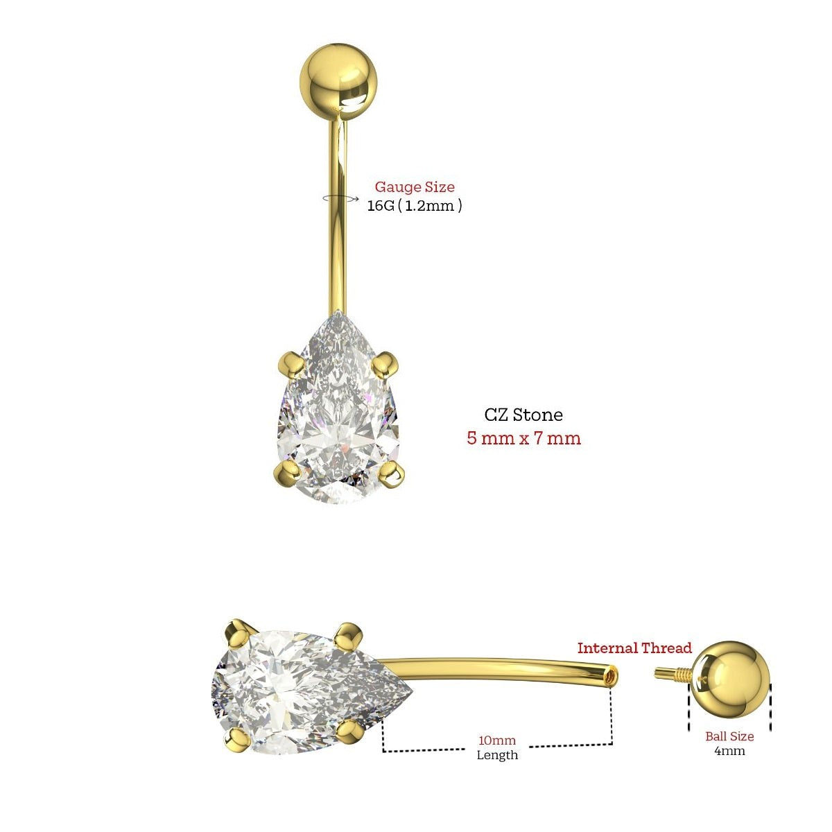 Internally threaded 14 Karat gold curved barbell with beautiful teardrop shaped cubic zirconia - perfect jewellery for eyebrow, vertical lip, daith, rook, and more.