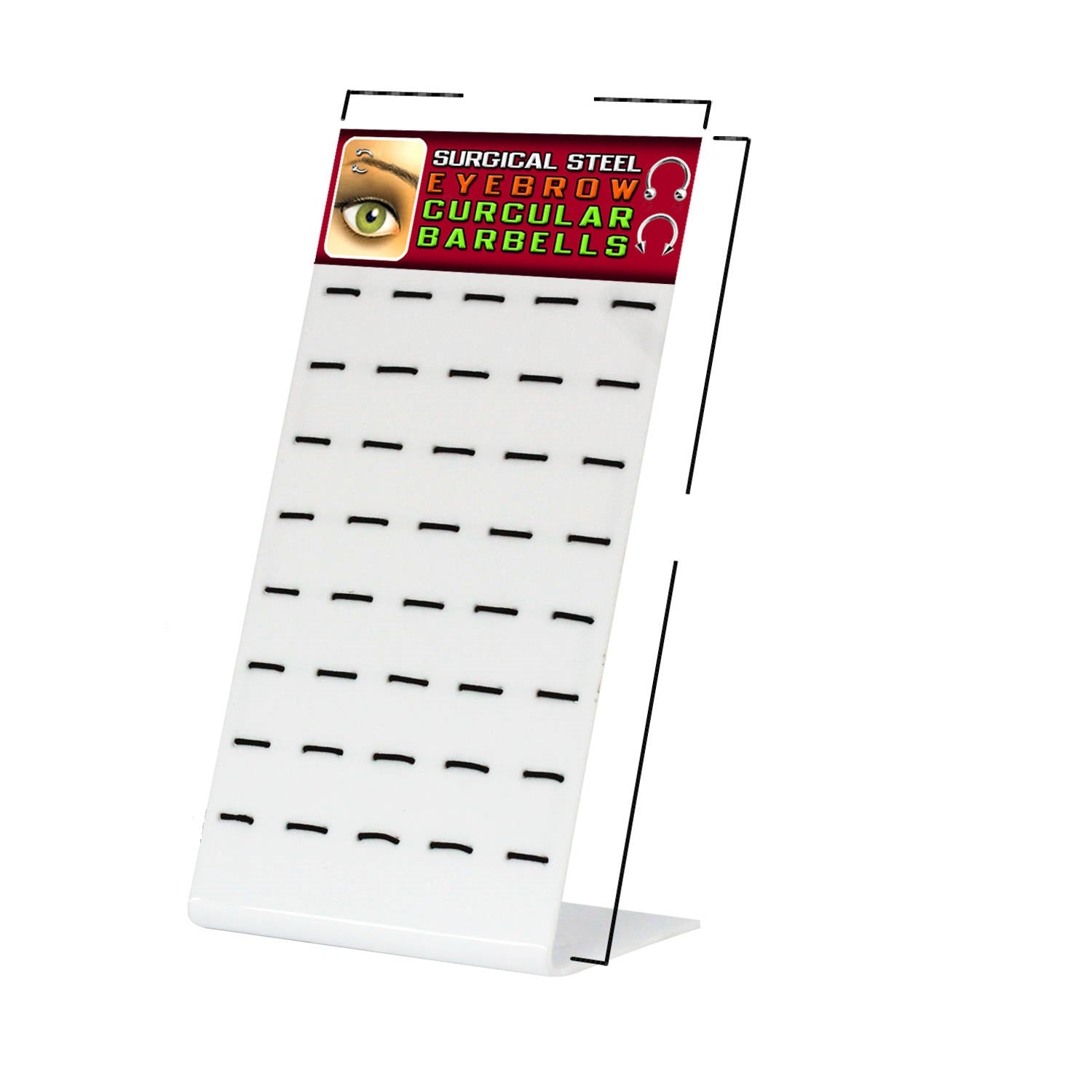 Acrylic stand with 40 elastics to hold piercing jewellery. Excellent for curved barbells, horseshoes, and other jewellery.  Empty - does not come with any jewellery.
