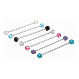 316L Surgical steel industrial barbell with tiffany balls with silicone coating so the gems do not fall out.  Externally Threaded.