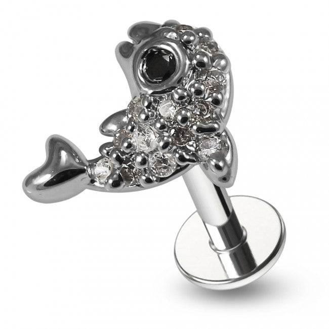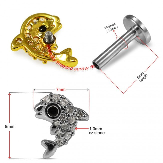 Beautiful jewelled dolphins are on the top of these IT labrets.  You can use these internally threaded flat back labrets for lip, monroe, helix, tragus, and so much more.