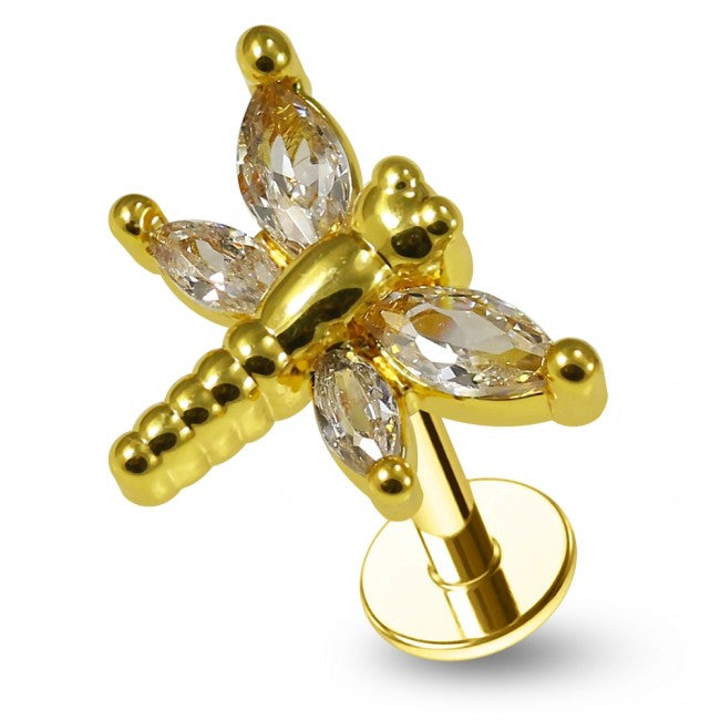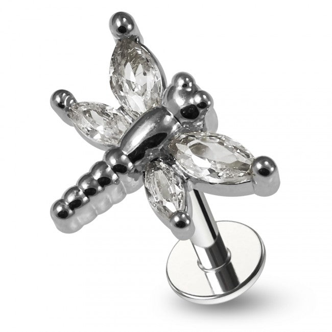 A beautiful jewelled dragonfly adorn the top of this labret.  You can use these internally threaded flat back labrets for lip, monroe, helix, tragus, and so much more.