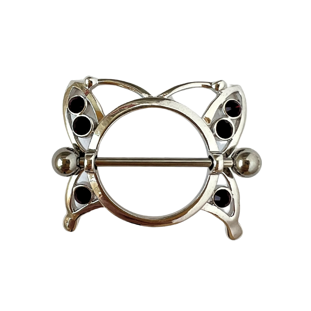 316L Surgical steel nipple shield in a butterfly design with deep red gems.