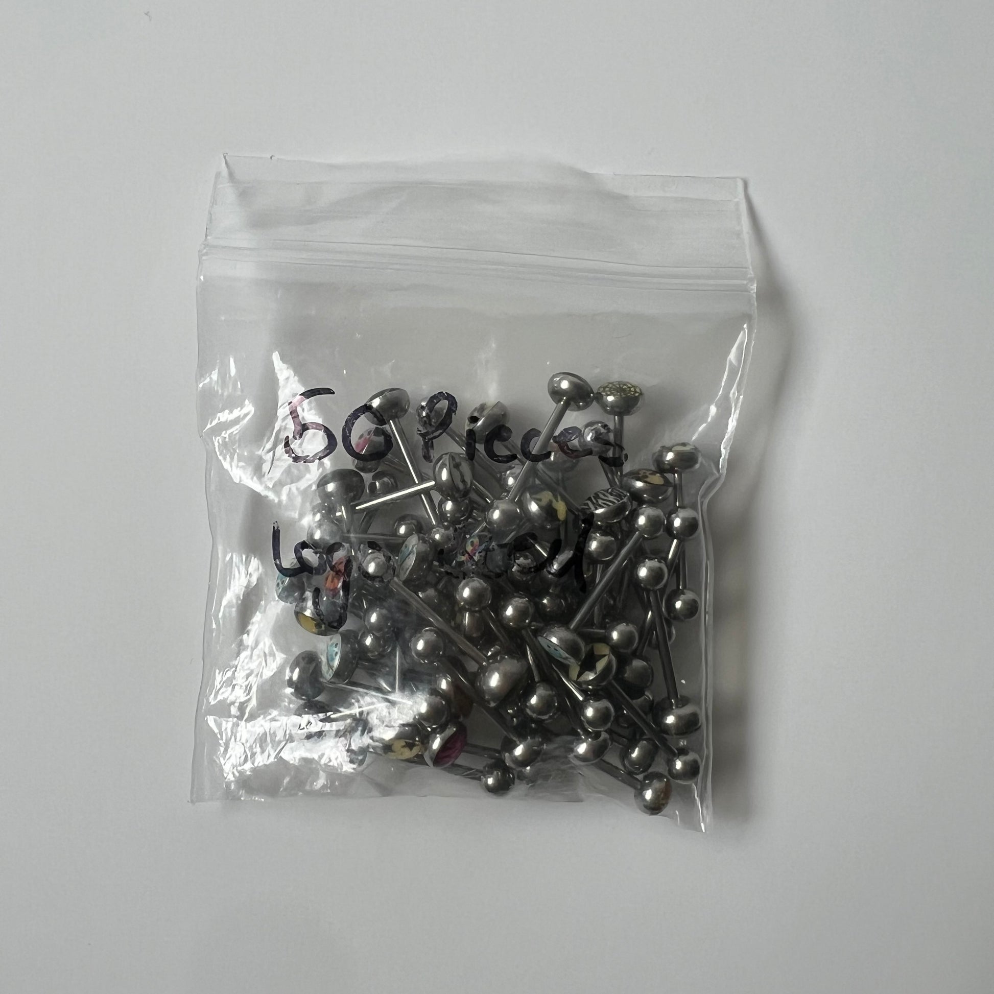 An assorted back of 50 surgical steel tongue barbells with steel logo design balls. Externally Threaded. Designs vary from leopard, to stars, to anchors, to skull & crossbones, and more.