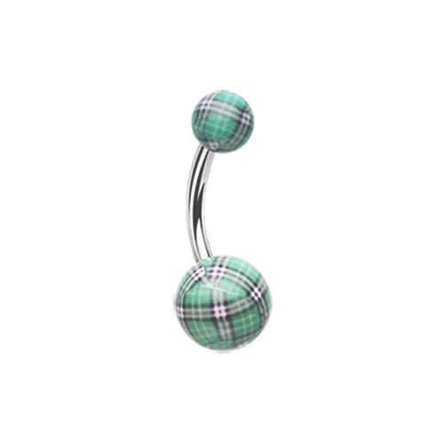 316L Surgical steel belly banana with acrylic balls with plaid design.