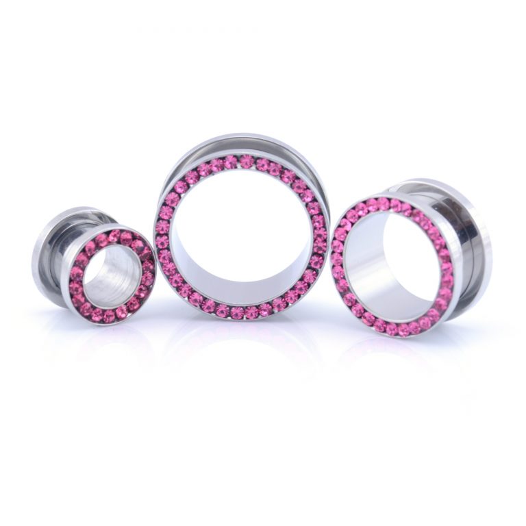 316L Surgical steel machine head tunnels with pink jewels.