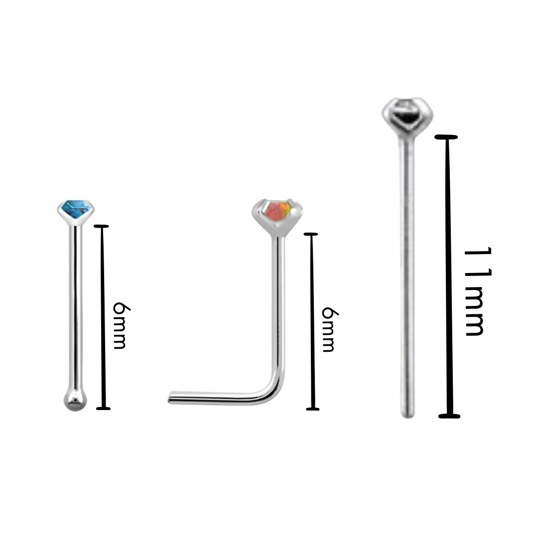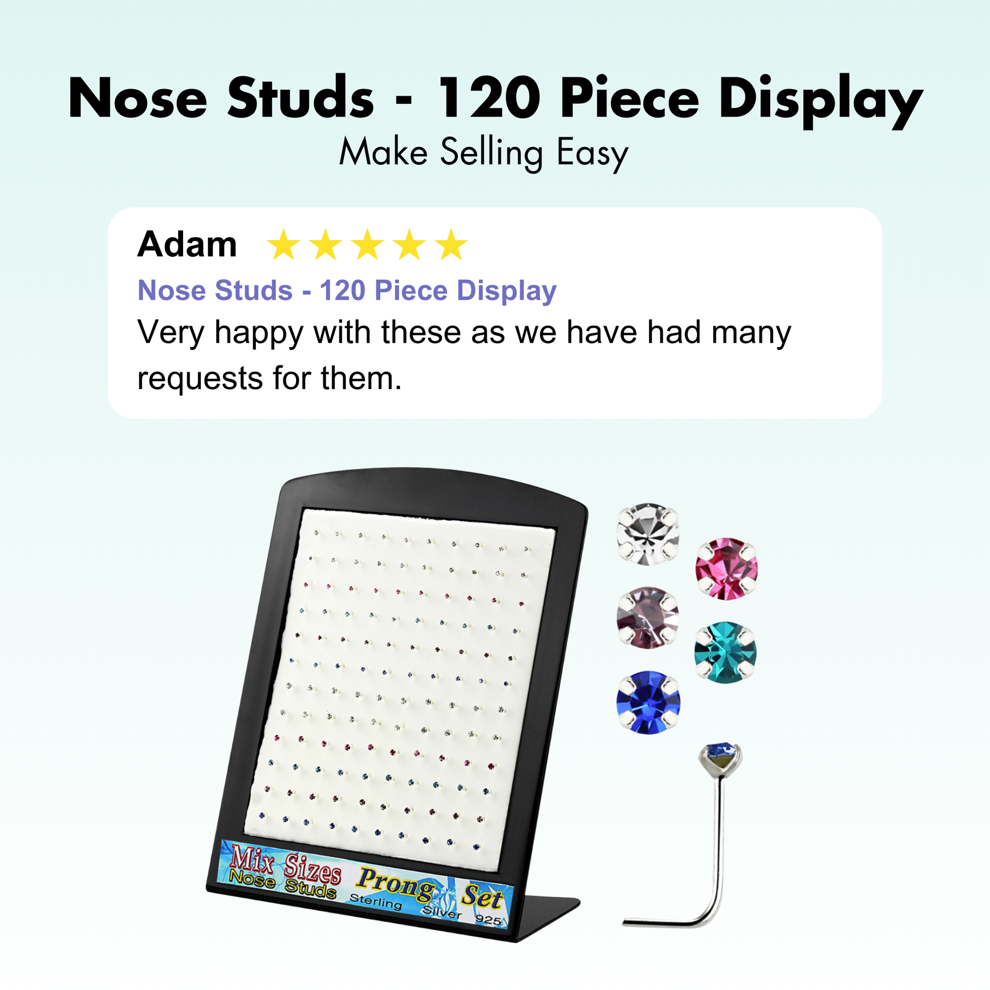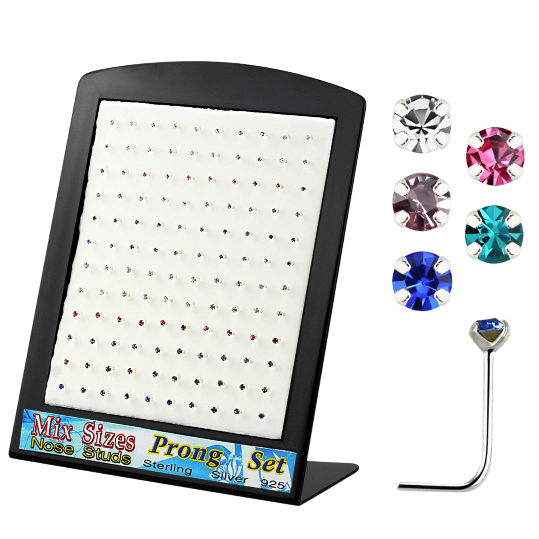 Sterling silver nose studs on a display stand of 120 pieces.  Available in nose bones, L bend, or Bend it Yourself.