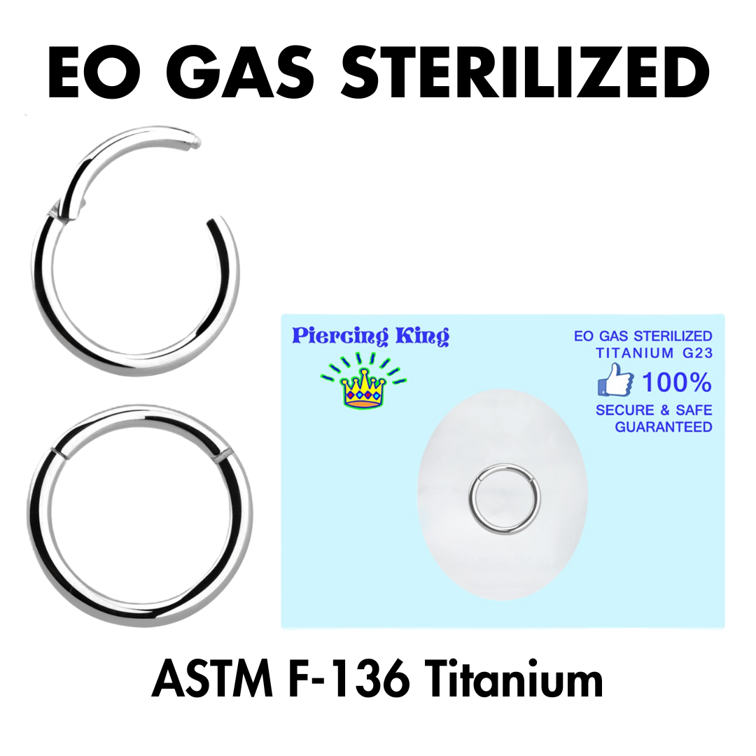 EO Gas pre-sterilized titanium hinged segment rings.  These hinged clickers are perfect for almost any piercing.