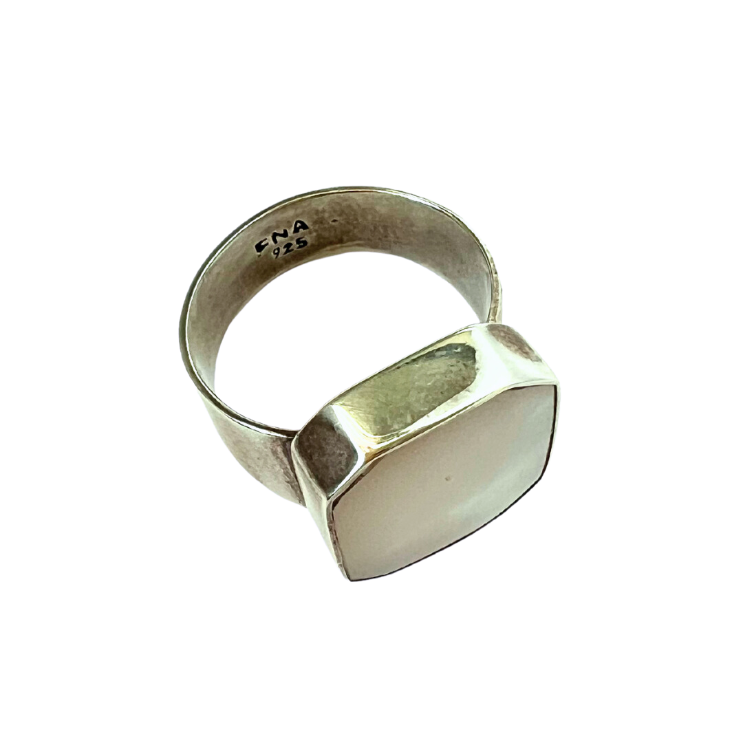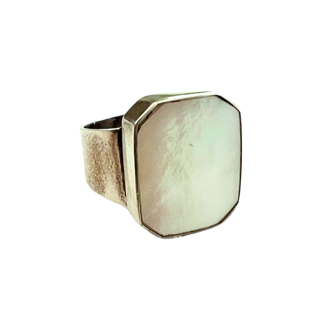 Sterling silver ring with a thick silver band and a large rectangle-shaped genuine mother of pearl set in the center.