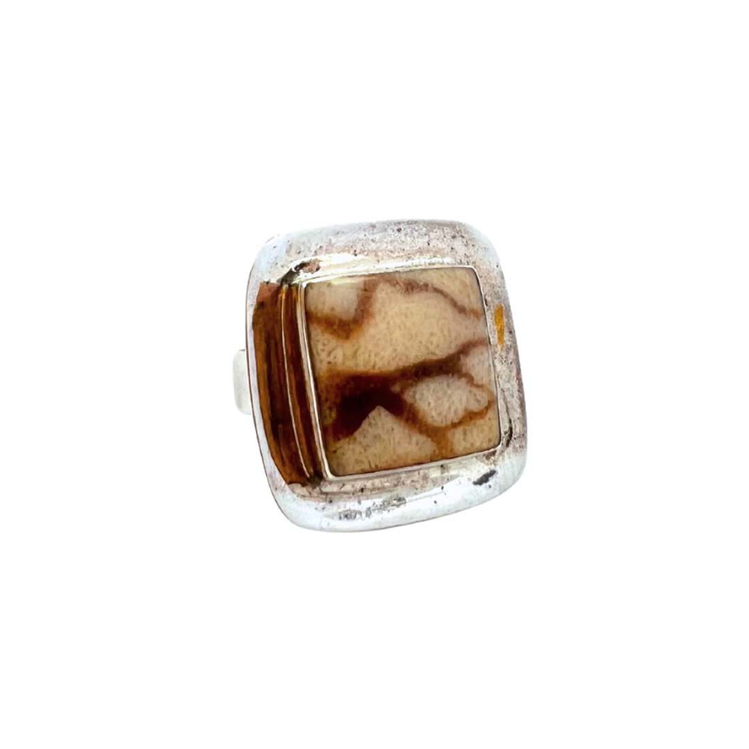 Sterling silver ring with a beautiful honey brown square cabochon gemstone.  Stone may be aragonite or agate.