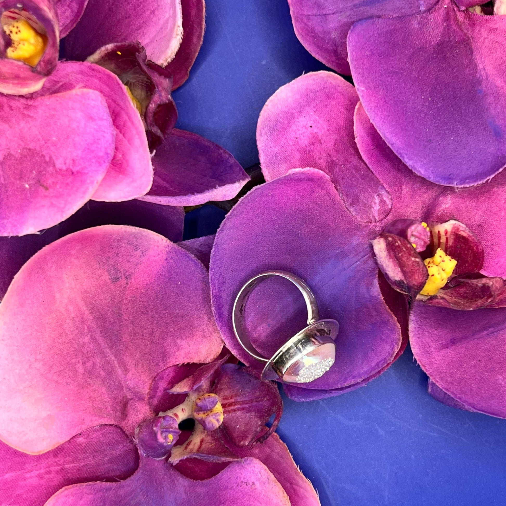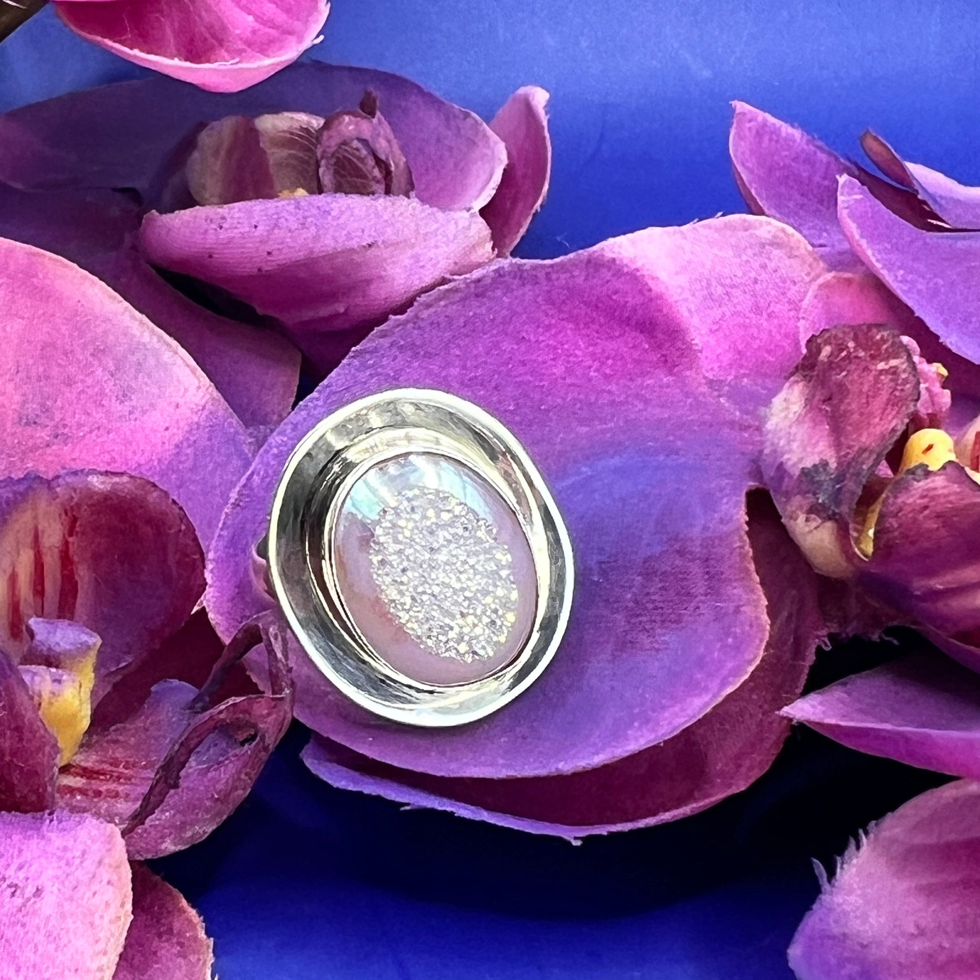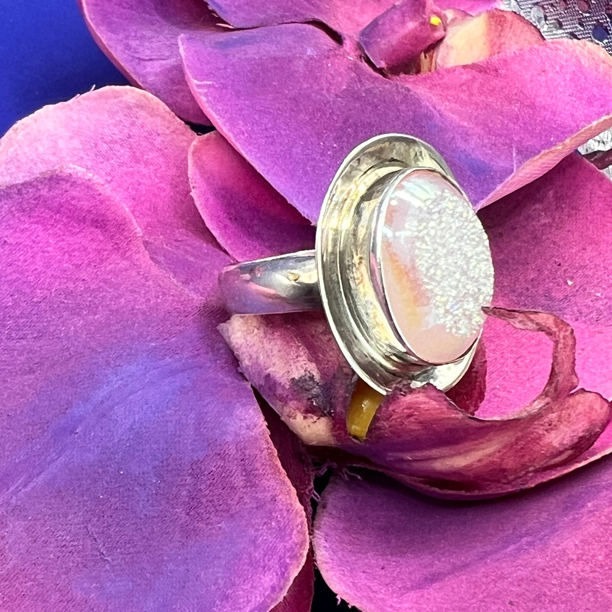 Sterling silver ring with an oval shaped natural pink stone with a rough cut sparkly top.