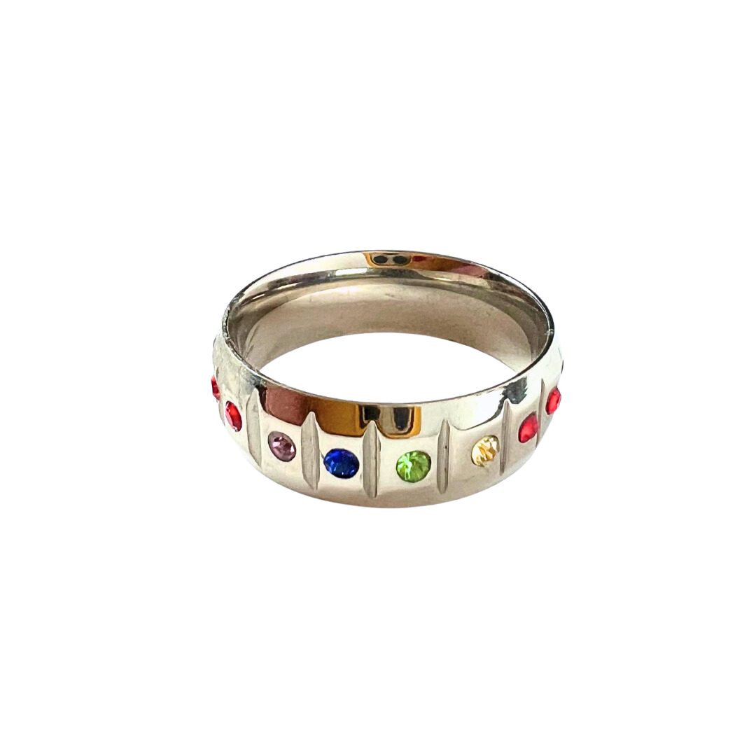 Stainless steel ring with rainbow cubic zirconia gems all around the band.