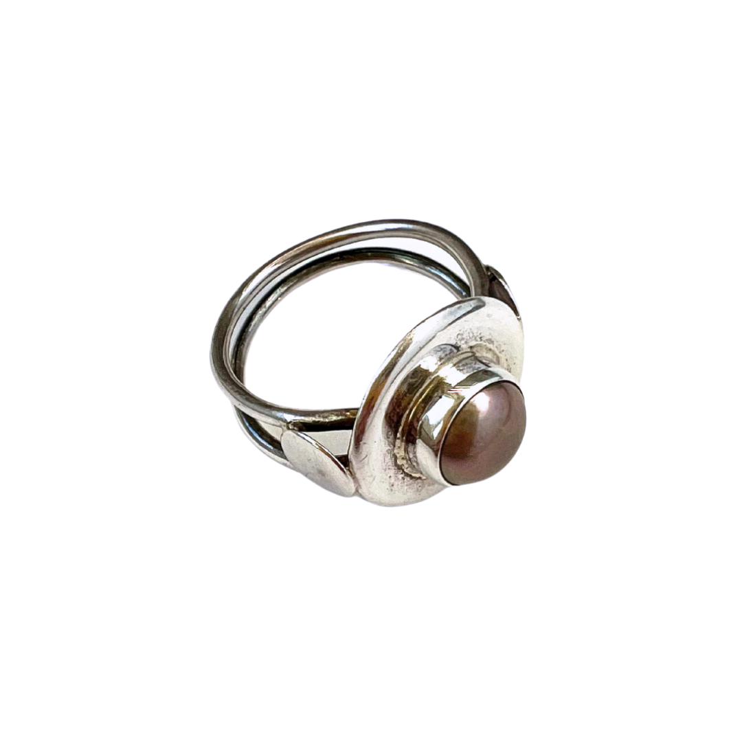 Sterling silver ring with a genuine pearl set in the center of a silver disk.
