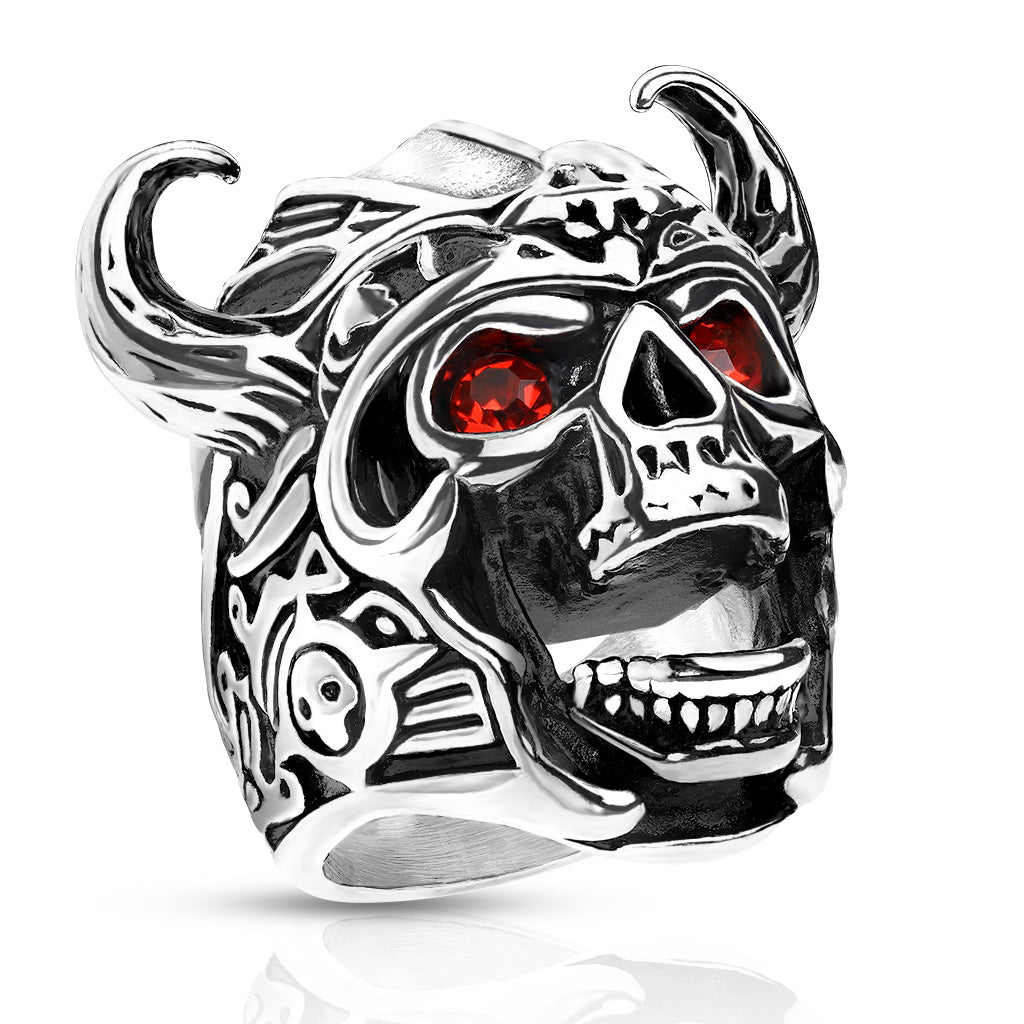 This stainless steel ring has a large skull with red gem eyes, and fierce horns.